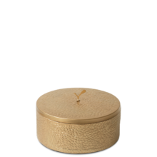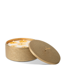 The wax is hand-set in a luxurious Moody Gold, imperfectly handmade and shabbily chic, engraved metal casing. Elegantly completed with a matching lid to snuff with and keep the scent inside.